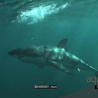 Select options DownloadA pair of Great white sharks gently swimming underwater in ocean passing by camera 2S UW HAND