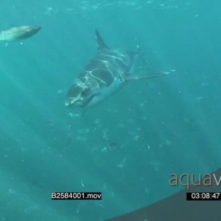 Select options DownloadGreat white shark gently swimming underwater in ocean passing bait line and turning back and bumping the camera UW HAND