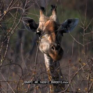 CU of giraffe’s head and neck eating leaves off a tree