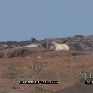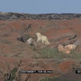Polar bear constantly looking back alerted walking away amongst boulders after gun flair shoots fired