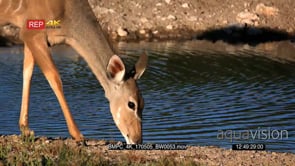Greater kudu drinks from a watering hole as a black-faced impala walks by and springbok looking from distance