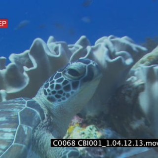 Green Sea Turtle swimming near ocean bottom with lots of boulders FF