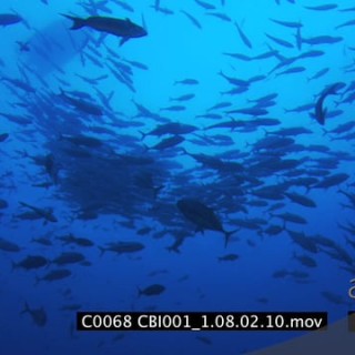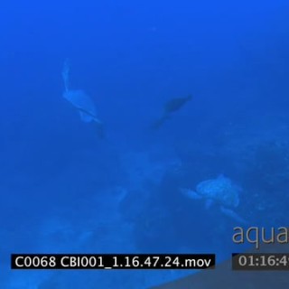 Shoal of Tuna fish, Green Sea Turtle swims past in bg MWS