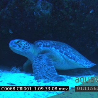 A Green Sea Turtle,Chelonia mydas swims past the camera at night