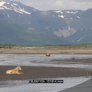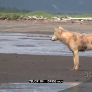 Wolf fishing for salmon along with Brown Bears in Alaska Katmai National Park. AmCam