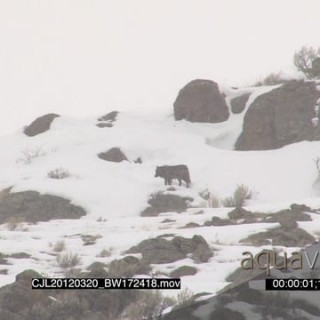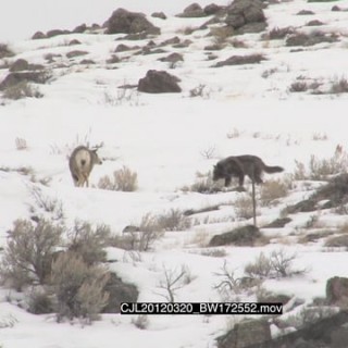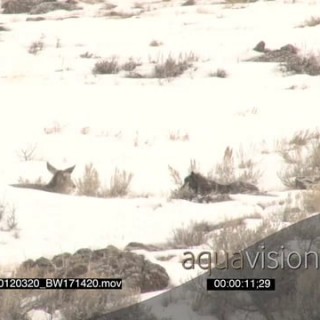 Gray Wolf walking around huntion snowy prairie and Elk Antelope standing looking at it WS PAN