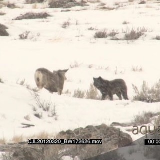A pair of Gray Wolves standing and sniffing on the ground then walking off LS HAND