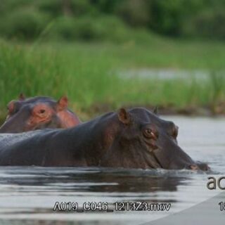 Two adult Hippos submerged, attacking, with eyes, ears and nostrils above the water surface.