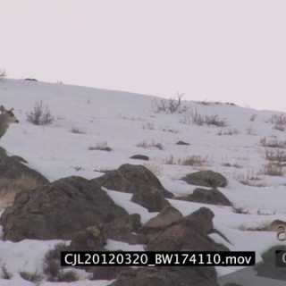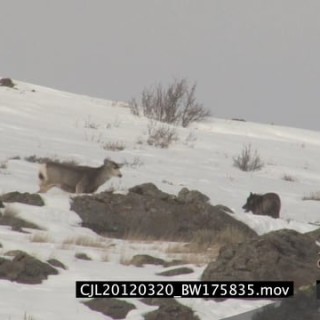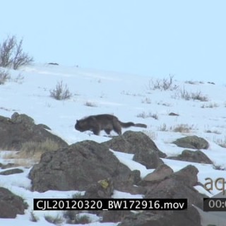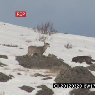 Gray Wolf walking and running around on snowy prairie and Elk Antelope standing looking at and intimidating it WS PAN