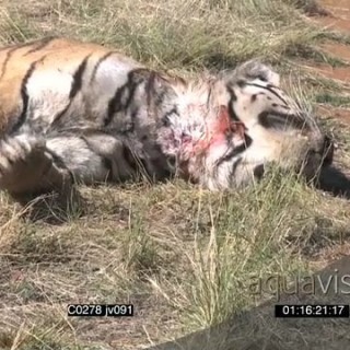 Lioness attack lone Cape Buffalo, Buffalo fight back. Elephant chases Lioness away, but Lioness kills injured Buffalo, AmCam