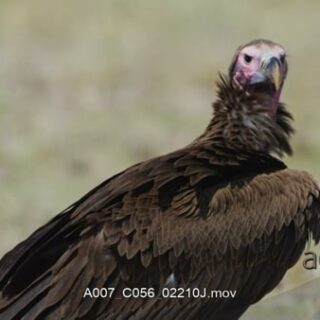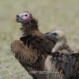 Two Lappet-faced Vultures standing, looking around and walking out of frame.
