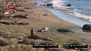 Elephant seal crawls onto beach where other elephant seals lay and rest, Males do dominance display WS; MWS