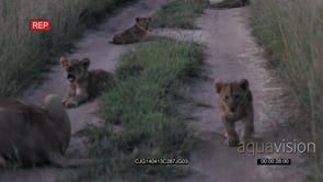 African Lioness and Male Lion Sitting in Long thick grass while the Lion cubs are walking towards the camera and they lay down