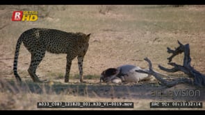 Tracking shot of a cheetah with its kill nervously keeping watch, then gets up and moves to the shade to rest