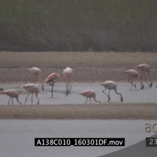 A flock of lesser flamingos in the ocean searching for food GOOD LIGHT MLS PAN