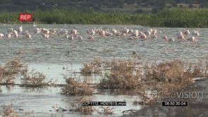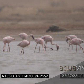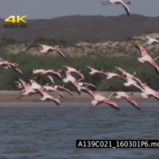 SCENIC A flock of lesser flamingos landing and walking in water then after a while they fly off GOOD LIGHT