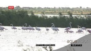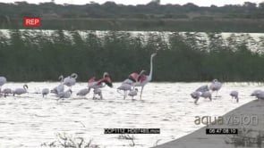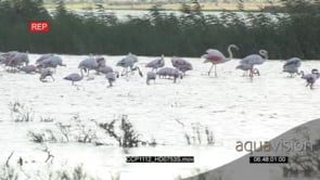 A flock of Flamingos landing and standing in the River Fishing GENERAL BEHAVIOUR