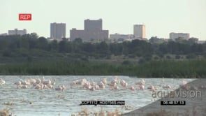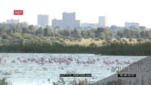 A flock of lesser flamingos flying around and landing in a river GOOD LIGHT