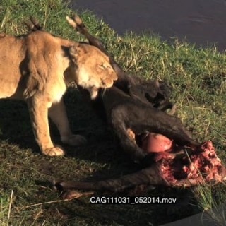 African Lioness standing near a kill on riverbank looking around and dragging it away HA LWS ZI MLS PAN