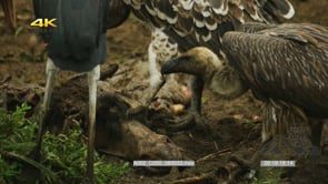 Select options DownloadFlock of Marabou stork, White-headed vulture and Cape vulture gathering, feeding on Cape buffalo carcass; MWS.