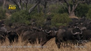 Select options DownloadHerd of young and adult Cape buffalo migration display, back view, running away and standing/looking around, WS;PAN;DAY