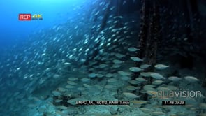 Huge school of scissor-Tailed fusilier, Caerulaurea and shrimp scad, Alepes djedaba shine silvery through the pier
