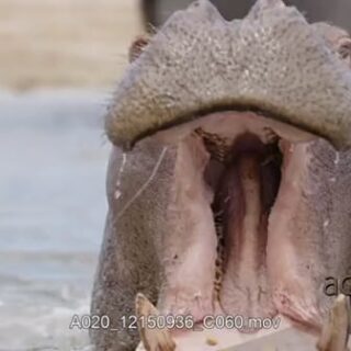 Intimidation display of a Hippo opening its mouth wide showing strength and aggressiveness.