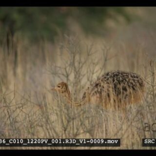 A tracking shot of an adult male ostrich walking through the grass and eating off the ground keeping guard