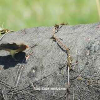 Oxpecker perched on the back of a Hippo making cuts and removing bugs, feeding on ticks.