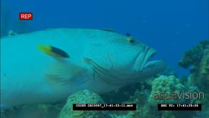 Peacock Rockcod getting cleaned by other small reef fish underwater in ocean then swimming away MCU