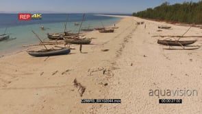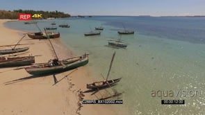 AERIAL of the Madagascar Island with fishers preparing to go for fishing and a boat sailing with people enjoying the ride GOOD LIGHT