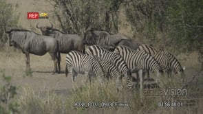 Zebra and Blue Wildebeest herds walking on bushveld and drinking from waterhole