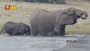Select options DownloadAdult female African Elephant mother with two young calves, playing with water, swimming and drinking. MCU;DAY