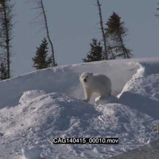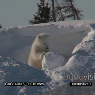 Polar Bear cub outside winter den playing with snow scouting around investigating area