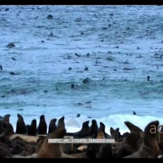 Tilt shot of hundreds of the cape fur seal colony at cape cross Namibia frolicking in the Atlantic ocean to the rest of the colony nursing babies on the beach