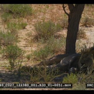 A male lion with a black mane looking directly at the camera stands up and lay down again under the shade of a tree grooming itself