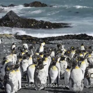 King Penguin colony, looking up,standing and preening themselves.