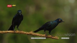 Gloosy starling pair on a branch one flies off another one lands