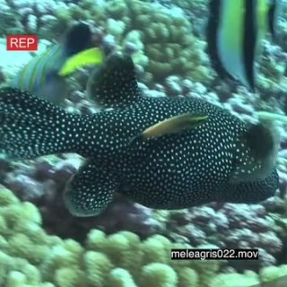 Redlip Wrasse following around cleaning Guineafowl Puffer swimming past Moorish Idols and Royal Angelfish feeding on reef algae
