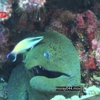Moray Eel hunting sticking head out of coral reef as Redlip cleaner wrasse swims around cleaning eel