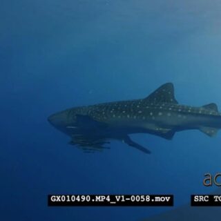 Medium close up shot of a juvenile whale shark with remora passing the camera