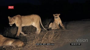 African Lionesses laying on side of dirt road looking in same direction then roaring MS