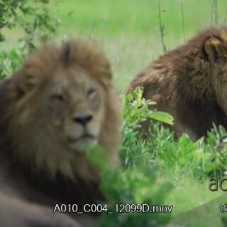 Two African Male Lion laying down, resting and looking towards the camera.