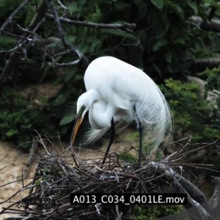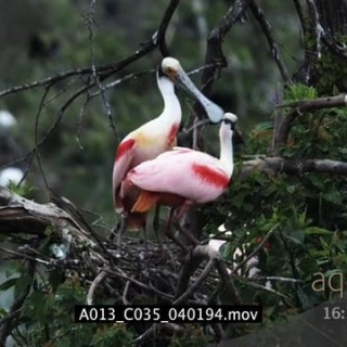 Great Egret nesting another standing on tree eating and Roseate Spoonbills moving in background MLS PAN TD