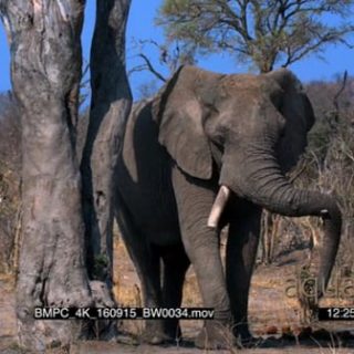 Elephant standing next to a tree where a Squirrel run down, elephant walks past camera out of shot