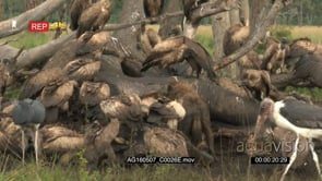 Select options DownloadDiversity of vultures and hyena gathered and eating from an elephant carcass, hyena chasing away vultures
