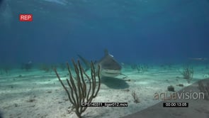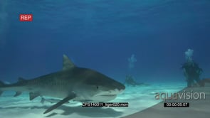 Tiger Sharks at bait bucket, swimming along bottom between Scuba Divers UW
