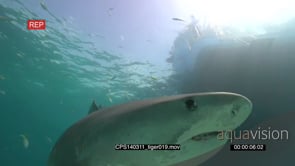 Tiger Shark swimming under boat, divers sitting on ocean floor looking at the Tiger Shark UW