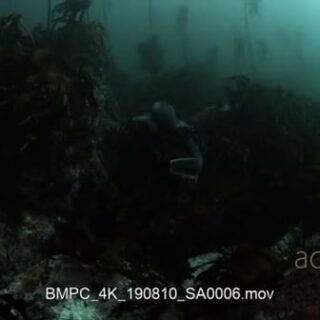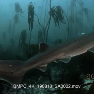 Close tracking shot of a broadnose sevengill shark, cow shark swimming away from camera towards kelp forest.