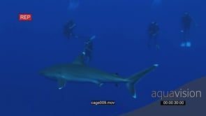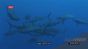 Select options DownloadGrey Reef Sharks swimming around bait underwater in ocean with divers floating nearby and Silvertip Shark passing by WS PAN HAND